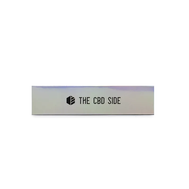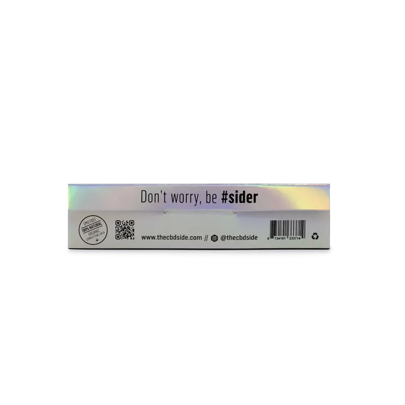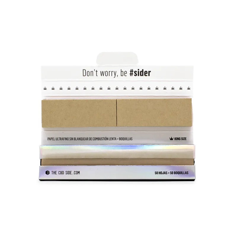 Papel The CBD Side ultrafino sin blanquear, tamaño King Size, de combustión lenta, con boquillas marrones, y caja holográfica.